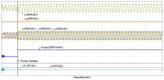 When the train speed changes from 200 km/h to 300 km/h, the grid current, the DC-link voltage and the stator currents will change as well, but is nearly zero and hardly changes; thus, no misdiagnosis occurs. The HIL results are shown in Figure 6. It can prove that the proposed method is not be affected by the change of train speed. When the load torque changes, the grid current and stator currents increase and there is larger fluctuation in the DC-link voltage, but do not change, so obviously there are no false alarms. The HIL results are given in Figure 7. It shows that the proposed method is robust to load torque change.