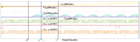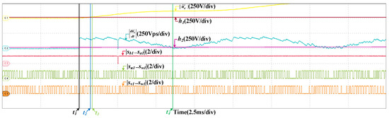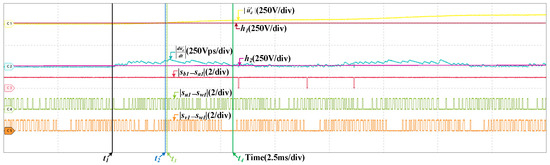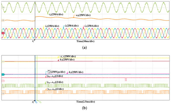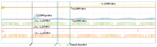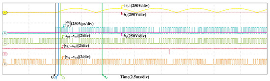 To verify the robustness of the proposed fault diagnosis method, the HIL tests are curried out at two different speeds. One is 200 km/h, and the other is 300 km/h. Figure 8 are the HIL results when the offset fault occurs in at 200 km/h. The offset value is 150 V, which is about five percent of . The fault occurs at . It can be found that the grid current and three stator currents do not change obviously, but increases immediately. grows rapidly, surpassing almost instantaneously, the fault is detected at . Then, there are instants that the values of , , and are 1 but always less than . If the fault occurs in , when is 1, will larger than . So the fault does not occurs in . Similarly, it can be proved that the fault does not occur in and . The fault is in and located at . The HIL result at 300 km/h is shown in Figure 9, the offset values is also 150 V. The gird current and three stator currents are larger, and the DC-link voltage fluctuates more, but the fault diagnosis process is similar and the fault can be diagnosed within a short time. The instants of fault occurrence, fault detected and fault located are , , and , respectively.