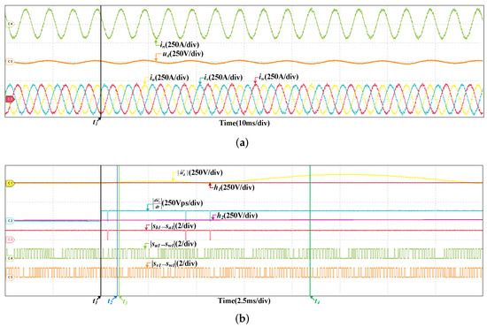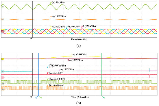 There are two types of faults are considered in the grid current sensor. They are offset fault and scaling fault, so the fault type should be determined in the process of fault diagnosis. Figure 10 are the HIL results of the offset fault in at 200 km/h, and the offset value is 10 A. Since the fault is incipient and the effect of closed loop regulation, the currents and voltage of the system are not affected much by the fault. However, there are security risks in the system, the fault may deteriorate at any time. Thus, it should be diagnosed in time. After the fault occurs, is influenced, it increases and surpasses quickly, the fault is detected. It can be seen that when , is larger than . When or , is larger than as well. If the fault is in , will always be less than , while a fault occurs in or , will be less than when or . So the fault is occurs in . Then, the fault is located. Then, in half a current period, there are no instants that is less than when . If the fault is a scaling fault, changes periodically, there will be instants that is less than when in half a current period. So the fault type is determined, which is an offset fault. Figure 11 are the results at 300 km/h, and the offset value is 10 A too. The fault diagnosis process is similar and omitted. The instants of fault occurrence, fault detected, fault located and fault diagnosed are , , , and , respectively. In the HIL results below, the meanings of , , , and are same to them in Figure 10, and not explained again. In this paper, the current sensor faults are incipient and the influences on the currents and voltage are not obvious, the grid current, the DC-link voltage and three stator currents have little different when the offset and scaling faults in different location. So, the currents and voltage results are similar to the results in Figure 10 (200 km/h) and Figure 11 (300 km/h). The results below do not include the information of currents and voltage.