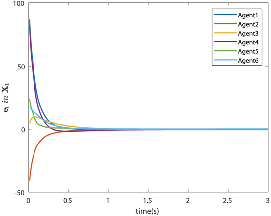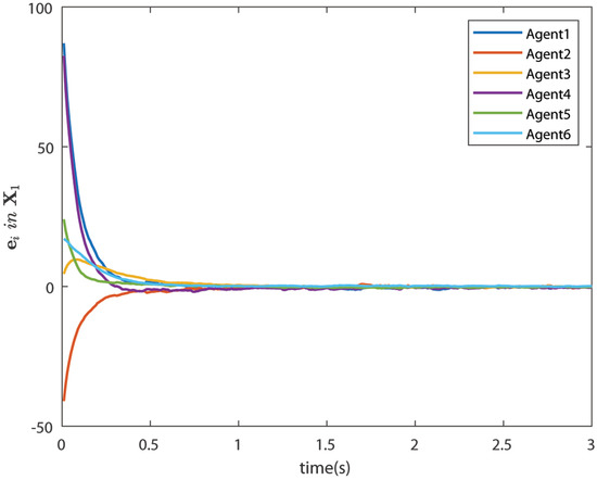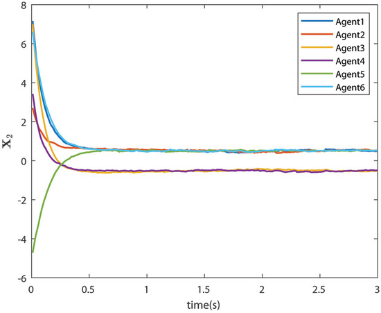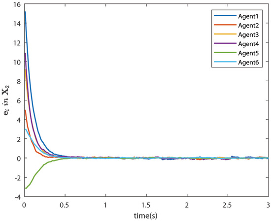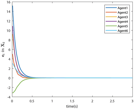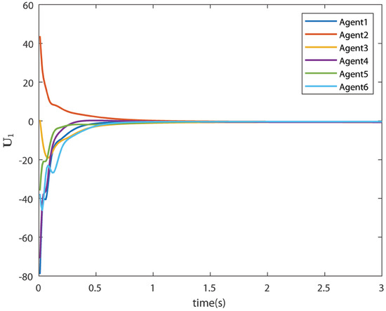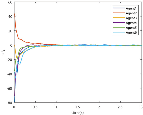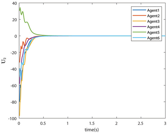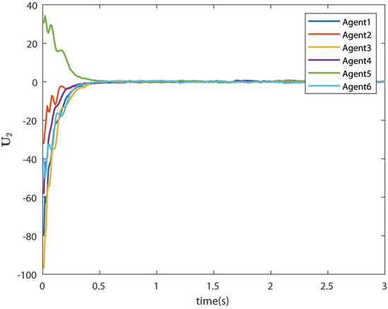 The control signals and obtained by DNDI are given in Figure 3 and Figure 4, respectively. These controls have generated the bipartite consensus among the agents. It can be observed that the states of the agents are divided into two groups. This is primarily for the signed graph and the consensus protocol used in this work. One group contains the agents 1, 2, 5, and 6. The other group contains agents 3 and 4. The states of all the agents, i.e., and are shown in Figure 5 and Figure 6, respectively. It is clear that the states of agents in each group achieved the consensus with different values. The consensus errors in states and are shown in Figure 7 and Figure 8, respectively. The errors converge to zero in a few seconds, which shows the effectiveness of the proposed controller.