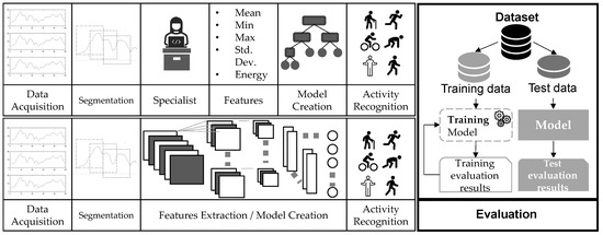 To find patterns in sensors data and associate them to human activities, the standard pipeline used in most works follows the Activity Recognition Process (ARP) protocols [7,11,13,27,28,29,30]. As depicted in Figure 1, ARP consists of five steps, acquisition, preprocessing, segmentation, feature extraction and classification [7]. Our work also includes the evaluation phase in the ARP pipeline to present in detail how validation methodology impacts the general performance of a HAR system. We can find in literature extensions of the standard pipeline with specific stages such as annotation and application stage [31], or even privacy and interpretability [32,33].
