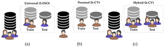 Universal systems must be capable of generalizing patterns of any subject. The most common validation procedure used in this context is the leave-one-subject-out cross-validation (LOSO) [45,51]. The LOSO considers the subject information when splitting the training and test set. This information is useful for preventing data from the same subject being present in both sets, as shown in Figure 2a.