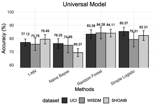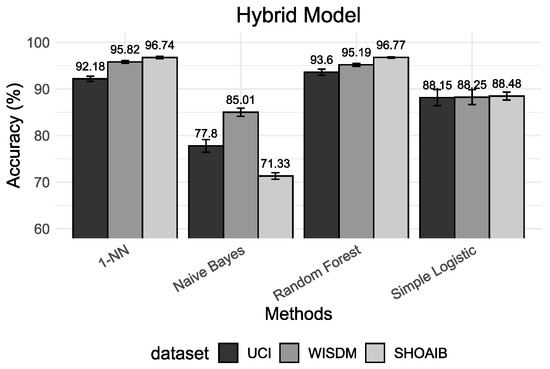 The hybrid model is used in many related works but they are not very suitable for real-world situations. Most of the commercial HAR applications have preferences for universal or personalized models. The results obtained from this model also present higher accuracy in the classification because some segments that belong to the same subject may be present in both the test set and training set, leading to an overoptimistic result. Again, this does not reflect the true accuracy.