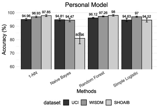 In personalized models, there is no problem if k-CV is used as a validation procedure since, for this type of application, the algorithm should aim at a model that fits the user. In this scenario, the classification algorithms have higher accuracy since the classification model was trained with instances that are very similar to those found in the test set. The very high accuracy values inductee that this is a suitable model for evaluating a customized application for a specific user. Besides, personal models can be trained with dramatically less data.