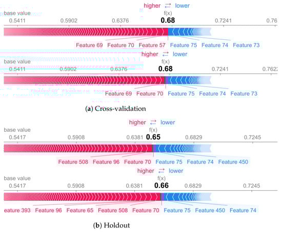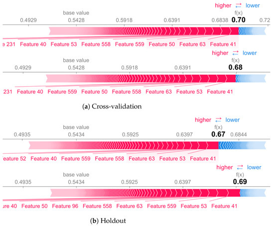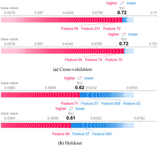 In addition, we use SHAP explanation method to understand how machine learning models tend to select different features based on the validation methodology. For this experiment, we have used UCI dataset with a 561-feature vector with time and frequency domain variables [26] using holdout and cross-validation to analyze how model select different features to make its predictions. We select the Random forest algorithm to conduct this experiment. In Section 8.1 we also provide explanations of individual predictions using shap values based on subject number 9 of UCI dataset.