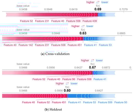 We can observe in these studies that, when analyzing the predictions individually for a given class, the classifier can change the order of importance between the features, but we perceive these changes more drastically when holdout and cross-validation are compared.