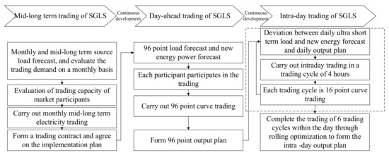 With the advancement of China power market reform, the construction of the power spot market continues to advance. Different from the mid-long term market, the spot market responds to more uncertain factors [1,2]. Especially under the dual carbon strategy, the proportion of new energy sources, mainly wind power and photovoltaic, continues to increase, improving the uncertainty of source side resources [3]. At present, the access of a large number of source-load resources has a large uncertainty and will have a large impact on the power grid. China’s power market is in the initial development stage, and the interface between the mid-long term market and the spot market is rather ambiguous and not enough to address the significant impact of source-side resource uncertainty. In order to ensure the orderly development of China’s power market trading, trading is carried out by using regulated load (RL) and energy storage (ES) resources to reduce the adverse impact of new energy uncertainty on trading, which has become one of the important research directions [4]. The market of SGLS is a transitional link from the mid-long term power market to the spot power market that is currently being prepared in China. Compared with the energy market and auxiliary service market, the trading behavior of different subjects of regional source, load and storage is considered in the market of SGLS, and independent clearing is carried out according to demand. It can be used to form a balance of energy supply and demand by market-based means. The SGLS trading involves mid-long term, day ahead, and intra-day time scales. However, due to the expanding share of domestic new energy and regulated load users, while their power uncertainty is changing from time to time [5], especially in the trading of SGLS across mid-long term, day ahead, and intra-day time scales, the continuous impact of source load uncertainty is greater. Therefore, it is necessary to carry out mid-long term, day-ahead, and intra-day continuous trading of SGLS to deal with the impact of source load uncertainty on the trading, as is shown in Figure 1.