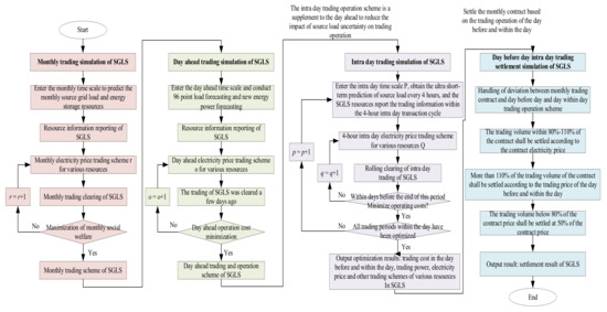 The simulation process of multi-timescale trading of SGLS based on the continuous trading mechanism proposed in this paper is shown in Figure 3. Firstly, the monthly trading simulation of SGLS is carried out. Entering the monthly time scale, the monthly prediction of SGLS resources is obtained, and the amount and quotation information are reported. The monthly electricity price trading scheme r of various resources is initialized. The monthly trading clearing of SGLS is carried out with the goal of maximizing social service. The clearing model is a nonlinear programming model, and CONOPT3 is used to solve the monthly trading scheme of SGLS. Secondly, the day-ahead trading simulation of SGLS is carried out. The day-ahead time scale is entered to obtain the source-load prediction data at 96 points in the region. SGLS resources completed the information reporting, and the day-ahead electricity price trading scheme of various resources is initialized. The day-ahead trading clearing of SGLS is carried out with the goal of minimizing the day-ahead operation cost. The clearing model is a nonlinear programming model, and CONOPT3 is used to solve the day-ahead trading and operation scheme of SGLS. Then, the intra-day trading simulation of SGLS is carried out. Each 4 h is an intra-day trading cycle and the intra-day time scale p is entered to obtain the ultra-short-term prediction data of SGLS in this trading period. The SGLS resources reports the trading information and initializes the intra-day electricity price trading scheme q of all kinds of resources in period p. The intra-day trading of SGLS is rolled out with the goal of minimizing the day-ahead intra-day operation cost as the end of this period. The clearing model is a continuous rolling nonlinear programming model. EMP and CONOPT3 are used for continuous optimization solutions until the end of all intra-day trading period optimization, and the day-ahead intra-day trading cost, the trading power, and electricity prices of all kinds of SGLS resources are obtained. Finally, the monthly–day-ahead–day trading settlement simulation of SGLS is carried out. The deviation between the monthly trading contract and the day-ahead day trading operation scheme is processed. For the trading volume that is actually implemented in the range of 80–100% of the monthly contract, the settlement is carried out according to the contract price. For the trading volume that is actually implemented in the monthly contract more than 110%, the settlement is carried out according to the day-ahead day trading price. For the trading volume that is actually implemented in the monthly contract less than 80%, the settlement is carried out according to 50% of the contract price. The settlement results of the SGLS transaction are obtained using accounting.