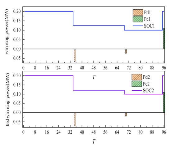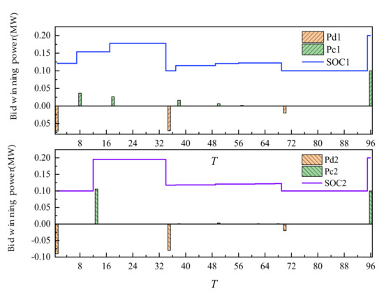 The day-ahead trading of ES is shown in Figure 7. The positive value of the histogram represented the charging power of ES. The negative value represented the discharge power. Additionally, the curve represented the residual capacity of ES. ES participated in the trading, along with its own energy time shift process. After the trading is completed, the two ES units are in the mode of one charge and two discharges, discharging at 35 and 70 points. Additionally, charging is completed at 96 points at one time. Through energy time shift, low storage and high generation of power are realized.