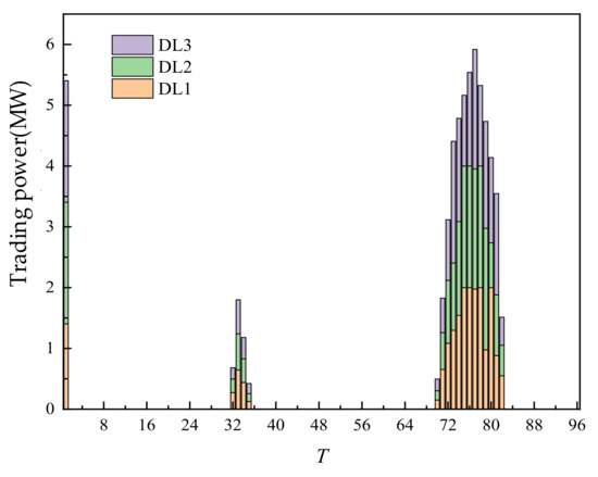 The day-ahead trading of RL is shown in Figure 9. The trading volume of RL is mainly concentrated at points 1, 32–35, and 70–82. Combined with the load curve of the user, points 32–35 and 70–82 are peak load periods with large demand. Especially, there is no photovoltaic output at points 70–82. Increasing thermal power output would make the unit cost exceed the unit cost of RL. Therefore, RL is called to achieve supply–demand balance. The RL traded at points 32–25 is less than that at points 70–82, mainly because the PV had output during this period, and the demand for thermal power units and RL is less. The large output of RL at point 1 is mainly because there is no PV available during this period, and the trading of RL is more economical on the whole.