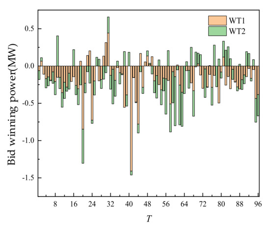 The intra-day trading of WT and PV is shown in Figure 13 and Figure 14 below. A positive value represented the power sold by WT and PV, and a negative value represented the power purchased from ES, thermal power units, and RL which is used to compensate the power part whose intra-day output does not meet the day-ahead trading volume. Compared with the day-ahead trading, the intra-day trading behaviors of new energy such as WT and PV included electricity purchase and electricity sale, which reduced the deviation between the trading value of new energy and the actual operating value from the mechanism and reduced the impact of the uncertainty of new energy output on its trading participation.