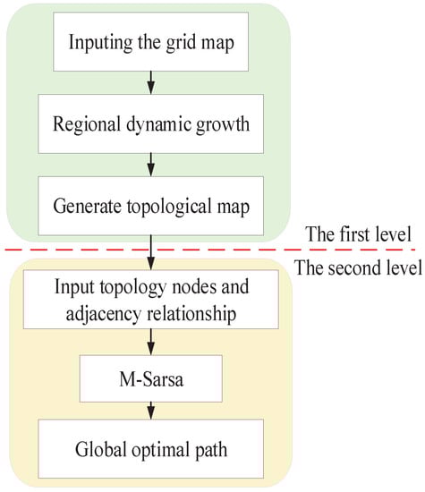 The Multi-SARSA algorithm divided into two layers is applied after obtaining a topological map to search a near-optimal path, which is based on the artificial potential field method to modify the Q-table in the first layer for reducing the blindness in the exploration. After which, so as to accelerate the training efficiency and convergence rate, the adjacency relationship of the topological nodes is conducted as the prior knowledge to initialize the second Q-table. In this way, instead of randomly traversing all the maps during learning, robots only traverse the current area and the candidate area connected with the current node based on the prior information, which limits the search space. Figure 2 demonstrates the framework of the proposed path planning algorithm.