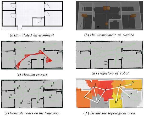 The simple simulation environment is built on Gazebo, and a topological map is generated of this environment as shown in Figure 3. Figure 3a is the design drawing of the simulated environment and Figure 3b illustrates the simulation environment. Figure 3c is the exploration process of the robot generating a raster map, in which the green line is the exploration trajectory of the robot and the red arrow is the odometer information. Figure 3d describes the final generated raster map. Figure 3e is the topology node generated in the map and the topological map example is shown in Figure 3f.