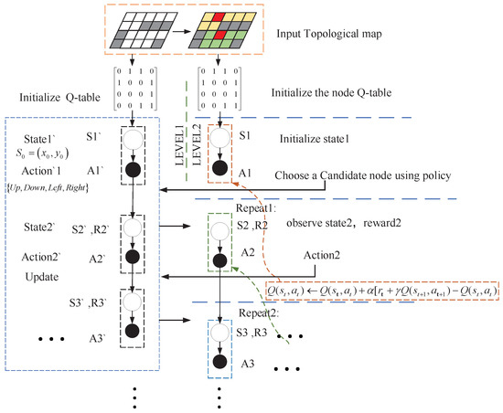 The single reinforcement learning-based path planning algorithm exists the problem that learning sample set is too large. In order to solve the problem, the proposed approach hence is divided into two layers. In the first layer, the pre-given topological nodes is set as the prior information to narrow the set of samples to be searched, in which the algorithm first chooses macro-level topology nodes by reinforcement learning (which is equivalent to the global path planning) and then selects the optimal candidate region according to the topology relationship. The method in this way avoids global search and narrows the search range. The algorithm will be explained in detail in Section 3.3.