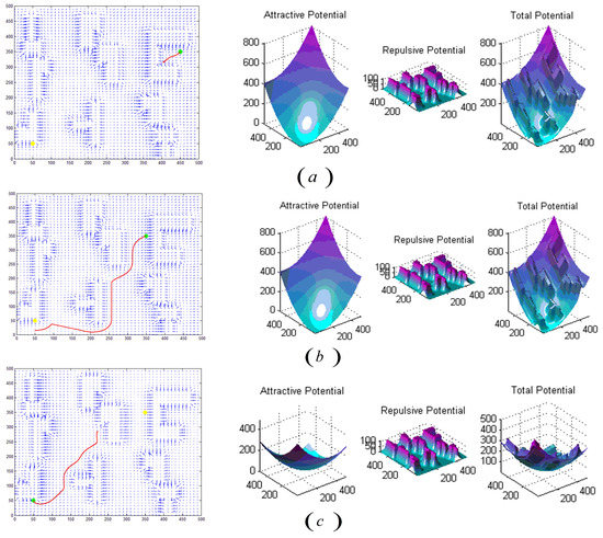 The path planning results of artificial potential field method on MATLAB: (a) Set the green dot in the upper right corner as the starting point and the yellow dot in the lower left corner as the end point, while the three-dimensional graphs of the attractive field, repulsive force field, and the total force field on the right side. Compared with (a,b) moved the starting point, and (c) exchanged the starting point and the end point. The result is shown in the figure.