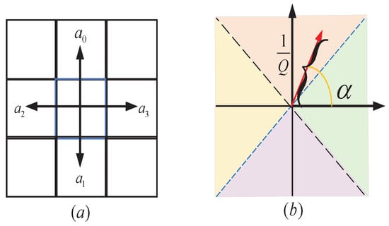 Then, the action is selected according to the angle of the resultant force, that is, the front, back, left, and right actions are divided by the angle of the axis. According to the angle range to which the deflection angle belongs to, the specific movement direction is determined, and the corresponding Q-value is updated. The angle margin division is shown in Figure 6b. The robot chooses the next action according to the Q-value of the surrounding 4 neighboring grids with a 90% probability of transferring to the grid which action has the largest Q-value and a 10% probability of moving one step randomly in the direction of the surrounding 4 grids.