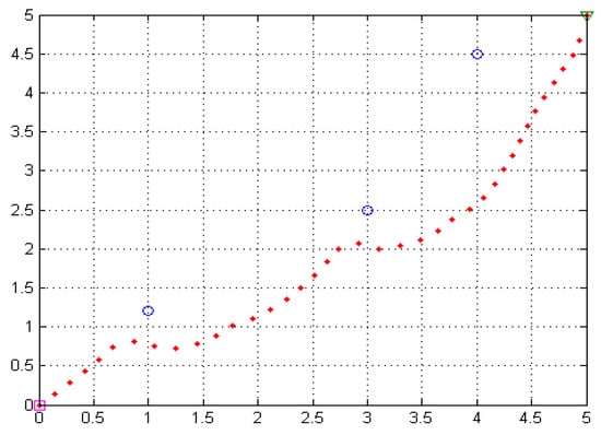 The successfully planned path in MATLAB corresponds to Table 1. The three blue circles in the figure are obstacles, and the red dots are the successfully planned paths.