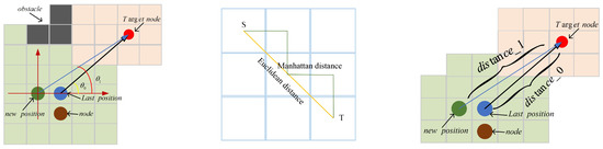 where is the azimuth angle evaluation function, which is used to evaluate the angle difference, that is, , as shown in Figure 8. In this paper, the method of is used to evaluate, which means the smaller the value, the higher the evaluation score. is applied to evaluate the distance between the current position and the target node, for which realization method is to compare the distance between the current position and the target node with the Euclidean distance from the previous position to the target node. Then, the reward value is given according to the comparison result, that is: .