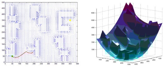 According to the gradient display of MATLAB, as shown in Figure 9, the green dot is set as the starting point and the yellow dot is the target point. Each small arrow in the figure represents the size and direction of the attractive forces at the current position. The gradient of position far away from the obstacle obviously points to the yellow endpoint. The closer the endpoint is, the smaller the gradient value; the gradient closer to the obstacle shows a tendency of repulsion, that is, a shorter distance from the obstacle results in a greater repulsion force.