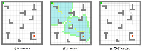 The second algorithm chooses the IDA* algorithm [27]. The IDA* algorithm that was proposed by Korf in 1985 is a consolidation of the A* algorithm and the iterative deepening algorithm, whose specific name is the Iterative Deepening A*. The IDA* algorithm is a re-optimization of the A* algorithm.
