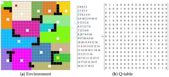 Assuming that the robot moves at a fixed speed, the robot can be regarded as a point in the experiment [9]. In order to reduce the path distance and direction angle of the robot, four actions are utilized in this article. As shown in Figure 6a, action 1, 2, 3, and 4 denote the up, down, left, and right, respectively.