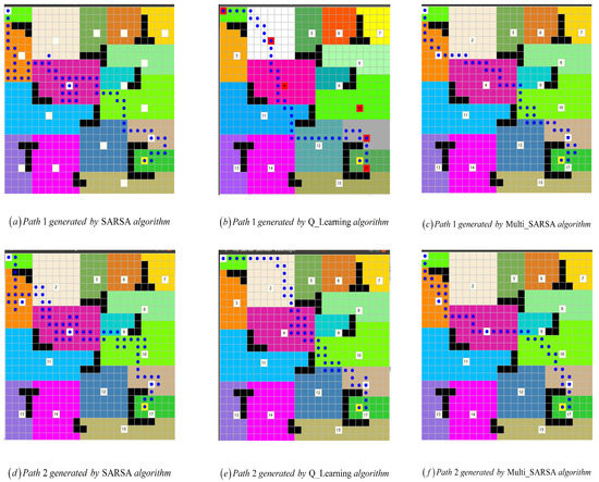 In the same environment, (a–c) are the planning results of the SARSA algorithm, Q-Learning, and the algorithm proposed in this paper, respectively. The colored part is a topological area, and one color corresponds to a topological area. The white dot is the selected representative topological node, the starting point is the upper left corner, and the end point is set in the lower right corner. (a,d) are the paths generated by sarsa algorithm, (b,e) are the paths generated by q-learning algorithm, and (c,f) are the paths generated by the multi-sarsa algorithm.