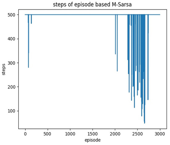 The learning rate and the discount factor are the same and set to 0.01 and 0.9, respectively. It can be concluded from the results as shown in Figure 13a that the effect of SARSA among the three algorithms is the worst. The results of the Q-learning algorithm as shown in Figure 13b are improved compared to SARSA, but the path length and the number of inflection points are not ideal. The M-SARSA proposed in this paper is improved the algorithm on the basis of SARSA; we can see that compared with the original SARSA, our results show that Multi-SARSA, as shown in Figure 13c compared with the Q-learning and A* algorithms, has more advantages in path length and the number of inflection points. Multi-SARSA’s step diagram is shown in Figure 14.