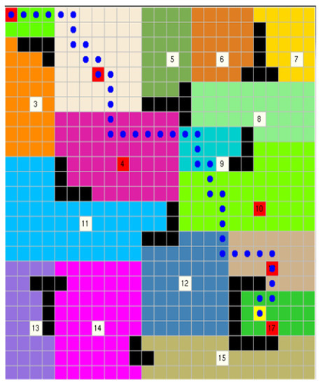 The schematic diagram of path planning mathematical model based on topological map. In the figure, is the starting point, is the the end point and the green points 1–18 are the topological nodes representing the topological areas.