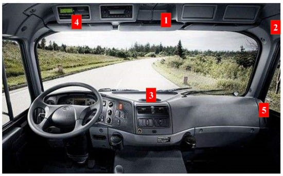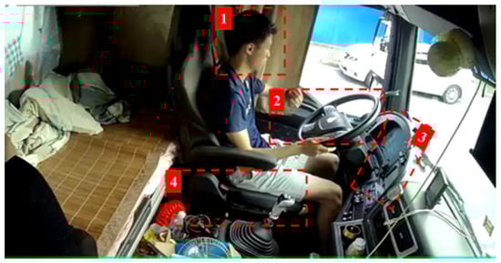 - Preparation stage, a primary investigation was firstly conducted on the cockpit structure of commercial trucks to learn about the distracted behavior of commercial truck drivers. In this stage, the appropriate view was also selected for obtaining the best shooting effect to reduce the avoidable error that might occur to the model. As shown in Figure 5, through the field test, the No. 3 and No. 5 view points were abandoned as the line of sight could not cover all the key areas, and the No. 4 visual angle point was abandoned as it would affect the driver’s driving. Finally, the No. 1 and No. 2 visual angle points were selected as the best view;