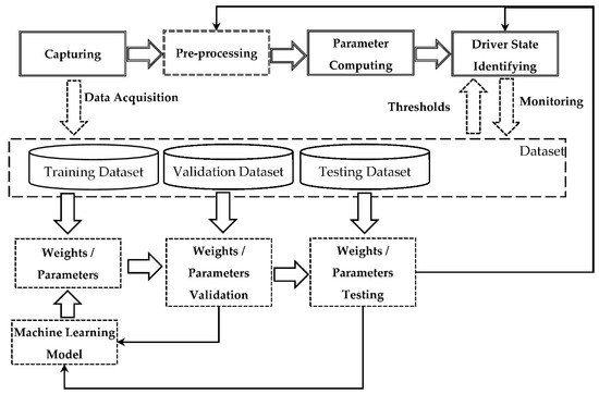 The threat detection sequence (top part, indicated by double lines) consists of the following stages: (i) Capture (represented by ‘Capturing’), (ii) Process/Compute analyzed parameters (represented by ‘Pre-processing’ and ‘Parameter Computing’), (iii) Analyze (represented by ‘Driver State Identifying’).