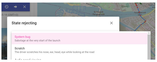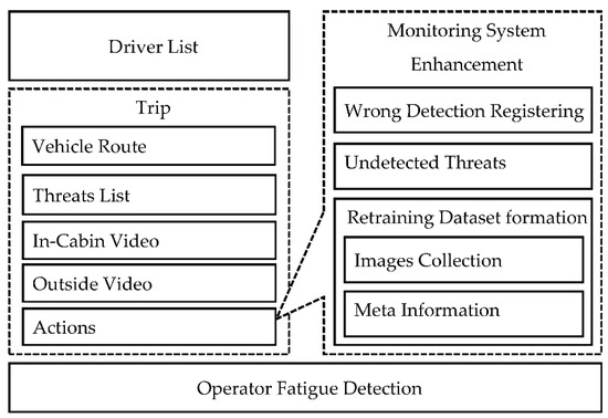 Trip process presents the following information to the operator: vehicle route, threats list detected by the driver monitoring system, in-cabin and outside videos related to each threat, and the possibility to mark each threat as wrong or correct, as well as to mark videos applicable for retraining dataset formation. Vehicle route is a graphical visualization on the map of the GPS/GLONASS data (telemetry) acquired from the vehicle in a map. Vehicle route is a convenient representation of the threats detected by the driver monitoring system. We propose to show each identified threat on the route. Therefore, in this case, the operator easily understands where the threat has been detected. Moreover, we propose to supplement each threat with in-cabin and outside videos, to help the operator to understand the situation when the threat was registered. In-cabin and outside videos are 20-s videos that include the situation when the threat was registered. Together with the vehicle route information the operator has the possibility to analyze the in-cabin as well as outside videos recorded during the whole trip (video registration). In the scope of the proposed reference model, we implemented the possibility for the operator to perform actions (mark every threat with labels) with detected threats.