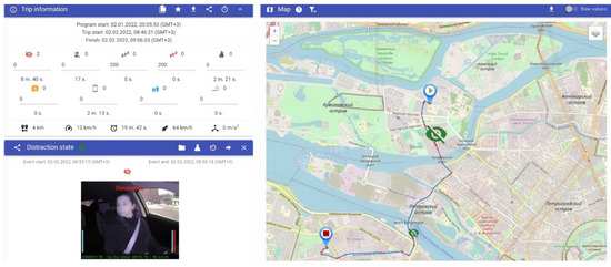 To test the proposed method and reference model, we developed a prototype for threat detection for vehicle driver and a dispatcher interface based on the reference model presented in Section 4. The right side of Figure 4 shows a vehicle route and detected threats. The left side of Figure 4 shows (1) some important information about the trip, including the number of threats detected and such characteristics as overall trip distance, average speed, duration, maximum speed, and maximum acceleration; (2) information about the selected threat in the map. In the presented example we show the inattention threat (see Table 1) that is detected, based on the driver’s head Euler angles [23,24].