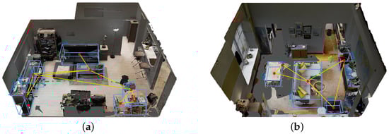 Illustration of the proposed object-level topological path planning for visual navigation. (a,b) shows two different indoor scenarios. The blue boxes represent the 3D object detection of object-level landmarks. The red dots indicate the nodes of the topological map. The yellow lines indicate the edges of the topological map. The green curve is the feasible navigation trajectory generated based on the proposed method.
