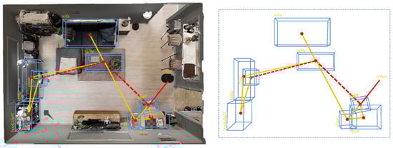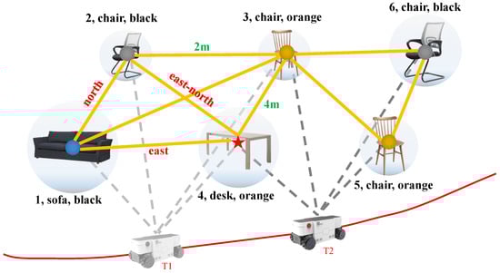 In this section, to meet the requirements of object-based heuristic path searching, a highly robust semantic–geometric feature is constructed, which fuses the high-dimensional semantic properties of objects with geometric spatial properties. On the one hand, the multi-attribute constraint matching based on semantic–geometric features between objects can provide heuristic evaluation for path searching and improve the efficiency of path searching. On the other hand, semantic–geometric features of objects can effectively improve the robustness of visual navigation under scene changes, such as illumination and occlusion. The illustration is shown in Figure 5.