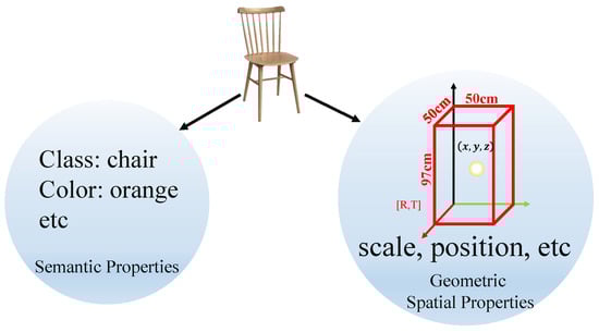 Schematic representation of the high-dimensional semantic–geometric features of the object. High-dimensional semantic-geometric features consist of semantic features (class, color, etc.) and geometric spatial features (scale, position, etc.).