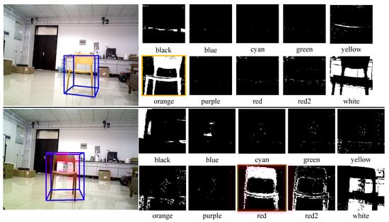 Experimental results of 3D object detection with embedded color attributes. The top and bottom columns represent the color feature extraction for orange and red chairs, respectively.
