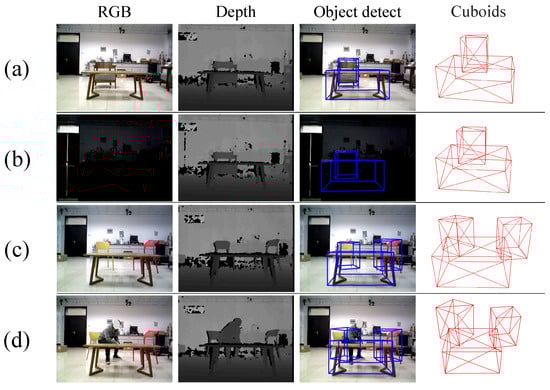 Four examples of 3D object detection results in real-world environments. (a,b) are the detection comparison results of the illumination variation. (c,d) are the comparison results of detection of occlusion and a dynamic object. Experimental results indicate that the proposed high-dimensional semantic-geometric features have high robustness.