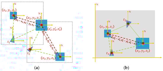 The high-dimensional semantic-geometric feature detection of objects has provided highly robust visual features for environment modeling and path searching. However, the semantic information learned by the model has not yet been considered relevant to autonomous robot movement. The information from object detection still needs to be translated into information in the robot coordinate system. To ensure effective path searching through the constructed topological map without global poses, we propose a robot-centric relative topological association constraint to obtain the weight of the shortest path searching. The topological association information of the environment is shown in Figure 9a. In the constructed topological map, we represent the relative directions between adjacent nodes as direction vectors in the calculation by converting the landmark and robot rigid body coordinate as well as the robot rigid body coordinate and the geomagnetic coordinate. As shown in Figure 9b, since the direction of the geomagnetic coordinate system is usually constant, based on the principle of coordinate invariance of vectors, the relationship between adjacent fixed nodes does not change with time and space. The specific implementation of the pseudocode is shown in Algorithm 1. Finally, is obtained by calculating the Eulerian distance of the topological edge.