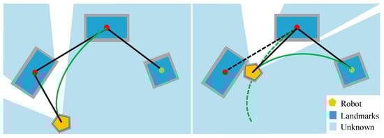 where is the binomial coefficient. Our online segmented trajectory generation is based on the end-point constraint property of the Bessel curve. The robot body is used as the first control point in each segment. Based on the order of the nodes in the one-way graph, the first node in the one-way diagram that is currently not detectable in the current local view range is used as the last control point, as shown in Figure 13. Therefore, according to the real-time local environment, the nodes in the one-way graph visible during navigation are used as current control points, and thus, the control points within each segment are dynamically variable, , m denotes m-segments.