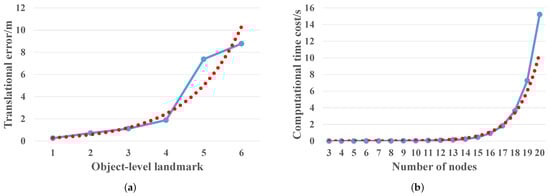 The performance of global segmentation strategy verification experiment. (a) Cumulative translation error. The solid blue line indicates the cumulative translation error of converting the six objects on the global topological path to the current robot coordinate system. The red dashed line indicates the exponential trend of the error. (b) Computational time cost. The solid blue line indicates the computational time cost of Bernstein polynomials as the number of nodes increases. The red dashed line indicates the exponential trend of the computational time cost.