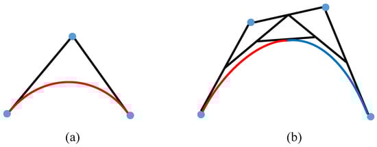 (a,b) are schematic diagrams of Bessel curves of second order and third order, respectively. (b) shows a geometric example of de Casteljau’s algorithm to split Bernstein polynomials. The Bessel curve on the left is shown in red, and the curve on the right is shown in blue.