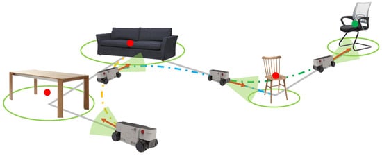 In this section, to extract the initial global path, we achieve the object-constrained topological global path searching via the lightweight object-level topological semantic mapping and an object-based heuristic graph search. In this paper, the overall path-searching cost is . is a heuristic evaluation by matching the multi-attribute constraint based on the semantic–geometric feature of the goal object. is the relative topological association constraint of the topological edge. Finally, a global topological path is obtained, which is a unidirectional graph composed of adjacent topological edges concatenated together, as expressed in Equation (1). The illustration of the object-based heuristic graph search method is shown in Figure 3.