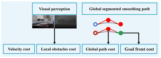 The multi-constrained local path planning strategy takes the endpoint of each global segmented trajectory as the stage goal point of local planning. To obtain the local linear and angular velocities, as shown in Equation (6), it determines the optimal local trajectory by calculating the overall loss cost of the sampled trajectory. The overall loss cost includes the global segmented Bessel trajectory cost constraint , the velocity cost constraint , the pointing target cost constraint , and the obstacle cost constraint . The velocity cost constraint is the translational component of the sampled velocity on the current trajectory, which keeps the robot’s velocity within a certain range.