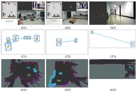 We further evaluate the performance of our method by comparing it with the well-known OGMADWA method in the real-world environment. Figure 16 visualizes the navigation environment. T1, T2, and T3 in Figure 16 correspond to the topological semantic maps of the three scenes, respectively, which are generated by our previous work []. G1, G2, and G3 in Figure 16 correspond to the high-precision occupancy grid maps of the navigation tasks respectively, which are generated by the OGMADWA method. Figure 20 shows the results of the visualization with the example of navigation in the S1 scene. We still choose SR and SPL as the evaluation metrics in the real-world experiment. For all experimental results, we report the median of 20 times.