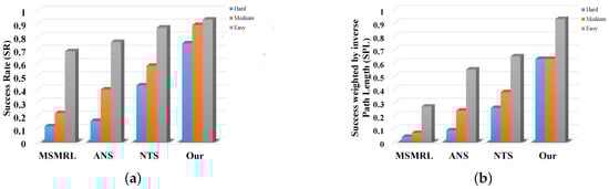 SRs and SPLs results for MSMRL, ANS, NTS, and our method on simulation scenarios. (a) Results of SRs; (b) Results of SPLs.