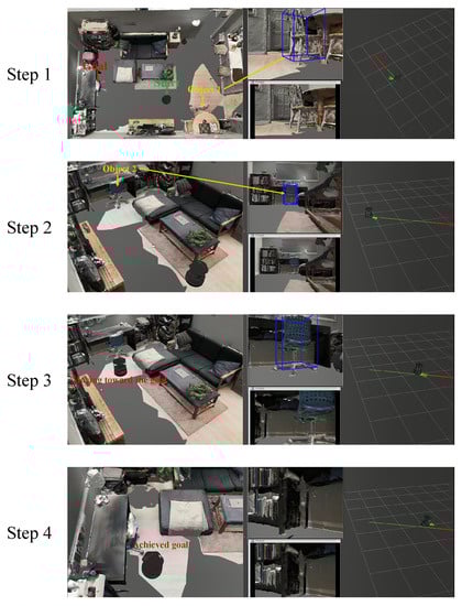 Visualization results for navigation in simulation scenario. The first step acquires global topological paths through active visual perception and object guidance, and generates segmented smooth trajectories. The second step determines the goal position by goal object evaluation and it generates segmented smooth trajectories. The third step moves toward the target location. The fourth step moves to within 1 meter of the goal object and publishes an "arrived" command to end the navigation.