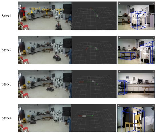 Visualization results for navigation in the S1 scene. We select an object-level topological path after constructing the lightweight topological semantic map. Then, the robot is guided from step one to step four to generate a segmented smooth trajectory to the next invisible object based on the currently visible object until it moves within 1 meter of the goal object and publishes an “arrived” command to end the navigation.