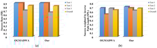 SRs and SPLs result for OGMADWA and our method on real-world datasets. (a) Results of SRs; (b) Results of SPLs.