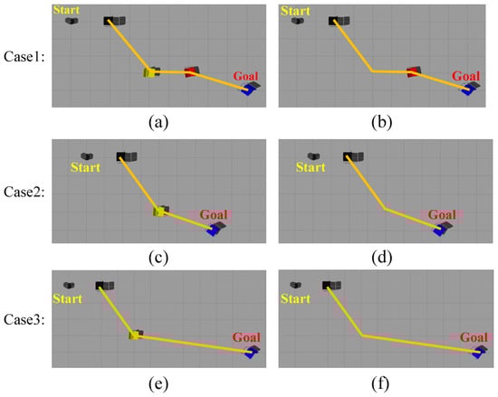 Navigation examples when objects in the environment models are moved. Yellow lines indicate the topological associations between objects. Case 1 shows that the robot can re-navigate through the surrounding red chairs after moving the yellow chair. The difference between Case 2 and Case 3 is that the distances between the goal object (blue chair) and the object being moved (yellow chair) are different. Case 3 shows that there is no detectable object around the robot and there is a risk of navigation failure after moving the yellow chair. (a,c,e) indicate the scenes before moving the yellow chair. (b,d,f) indicate the scenes after moving the yellow chair.