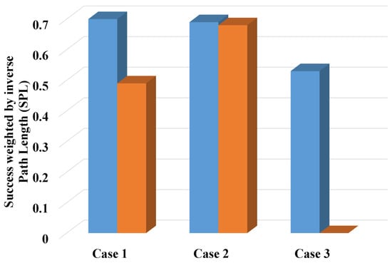 where N denotes the number of testing episodes, is a binary indicator of success in the testing episode i, represents path length, and is the shortest path distance from to the goal.
